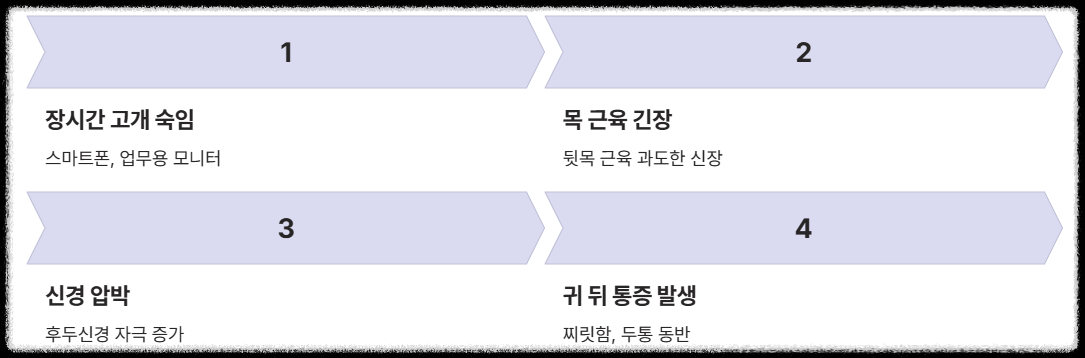장시간 고개 숙임 → 목 뒤 근육 긴장 → 신경 압박 → 귀 뒤쪽 두통 발생