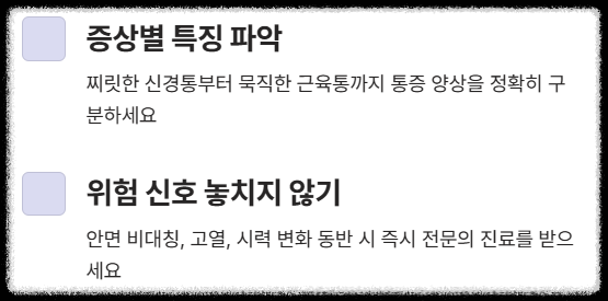 대부분은 적절한 휴식과 스트레칭으로 호전되지만, 만약 통증이 점진적으로 심해지거나 고열, 시력 저하, 마비 증상이 동반된다면 이는 단순한 피로가 아닌 '레드 플래그(위험 신호)'일 수 있습니다. 항상 여러분의 건강이 최우선입니다. 오늘 알려드린 내용이 불안감을 해소하고 건강한 일상을 되찾는 데 작은 도움이 되기를 바랍니다. 😊