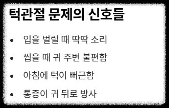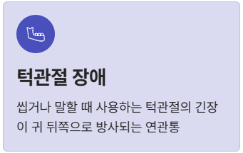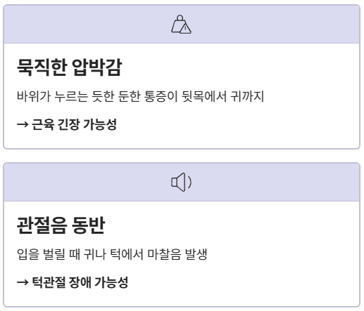 - 👄 관절음: 입을 벌릴 때 귀 뒤나 턱 부근에서 마찰음이 들린다.