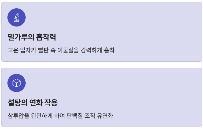 - 밀가루의 흡착력: 밀가루의 고운 입자는 빨판 속 이물질을 강력하게 흡착해 제거합니다.