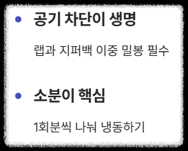 - 밀폐 용기나 지퍼백에 한 번 더 담아 이중 밀봉합니다. (냄새 차단!)