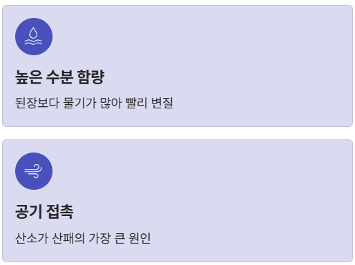 청국장은 바실러스균이라는 살아있는 미생물이 가득한 '살아있는 식품'입니다. 된장보다 수분 함량이 높고 염도는 낮아서 상온에 두면 발효가 지나치게 진행되어 쓴맛이 나거나 금방 부패할 수 있어요. 특히 공기와의 접촉은 청국장 산패의 가장 큰 원인이 됩니다.