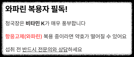 청국장은 비타민 K가 매우 풍부합니다. 와파린(항응고제)을 복용 중인 환자는 비타민 K가 약효를 떨어뜨릴 수 있으므로 섭취 전 반드시 전문의와 상의해야 합니다.