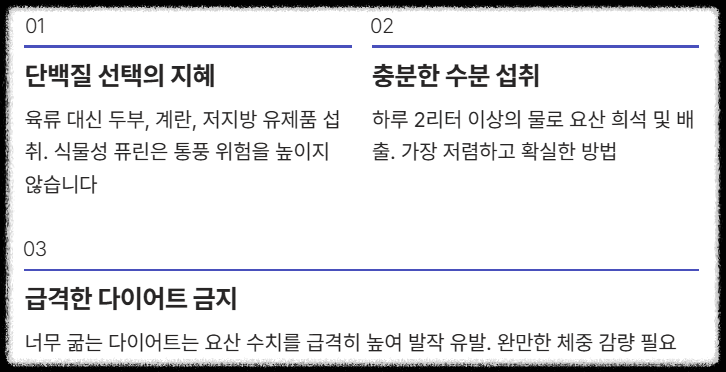 ✅ 수분: 하루 2L 이상의 충분한 물 섭취 (요산 희석)