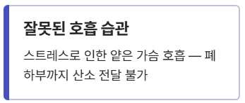 - 잘못된 호흡 습관: 현대인들은 스트레스로 인해 가슴으로만 짧게 쉬는 '얕은 호흡'을 하는 경우가 많습니다. 이는 폐 하부까지 산소를 전달하지 못해 폐의 효율을 떨어뜨립니다.