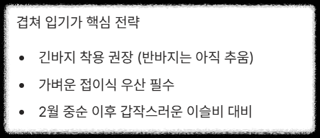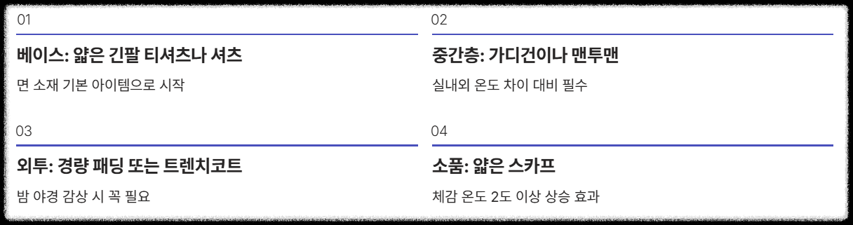 - 소품: 목을 보호할 얇은 스카프 하나만 있어도 체감 온도를 2도 이상 올릴 수 있습니다.