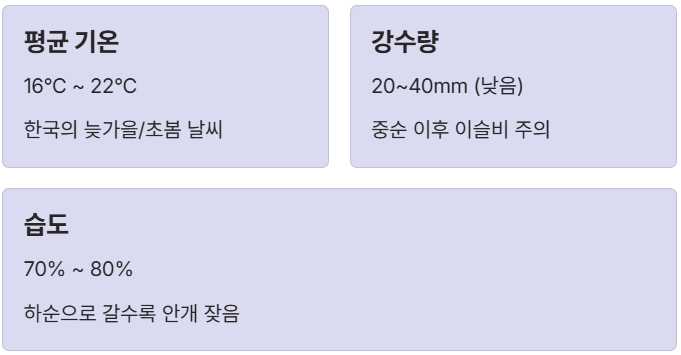 | 평균 기온 | 16°C ~ 22°C | 한국의 늦가을/초봄 날씨 |