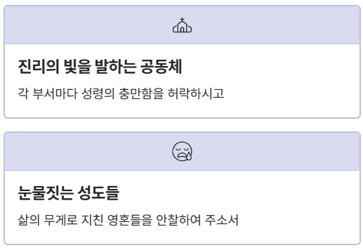 - 회중의 삶 투영: 개인적인 기도가 아닌, '우리'의 삶을 대변해야 합니다. 직장인의 고충, 수험생의 긴장, 어르신들의 건강 등을 고루 언급하세요.