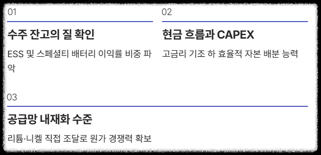 - 수주 잔고의 질 확인: 단순 수액보다는 중장기적으로 이익률이 보장된 ESS 및 스페셜티 배터리 비중이 얼마나 되는지 파악해야 합니다.