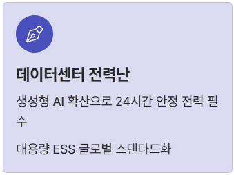 - 데이터센터 전력난의 해결사 ESS: 생성형 AI의 폭발적 확산으로 데이터센터의 전력 소비가 급증함에 따라, 24시간 안정적인 전력 공급을 위한 대용량 ESS 설치가 글로벌 스탠다드가 되었습니다.