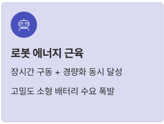 - 에너지 근육으로서의 로봇 배터리: 인간의 움직임을 모사하는 휴머노이드 로봇은 장시간 구동과 가벼운 무게를 동시에 만족해야 하며, 이는 고밀도 소형 배터리 시장의 폭발적 성장을 불러왔습니다.