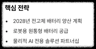 | 삼성SDI | 전고체 배터리 2028년 양산 및 로봇용 원통형 공급 | '꿈의 배터리' 상용화 선두주자 |