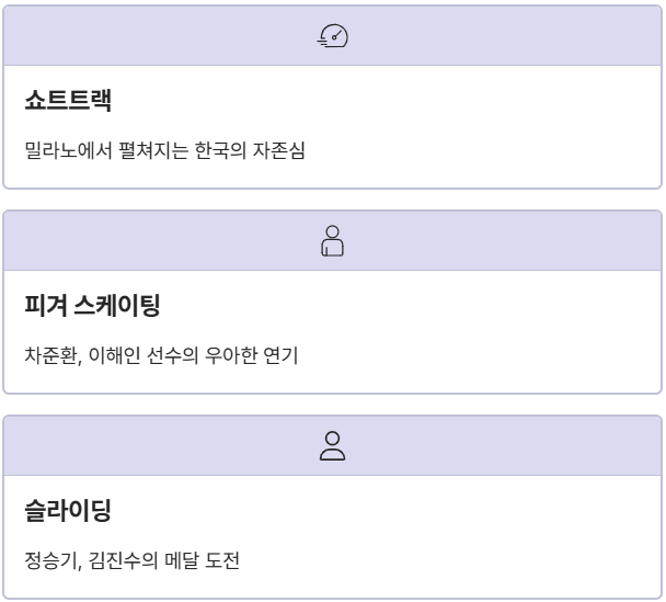 - 한국팀 포인트: 전통의 빙상 강세 유지 + 슬라이딩 종목 메달권 도전