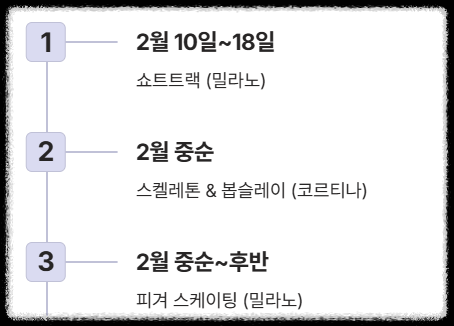 - 쇼트트랙: 대회 중반(2월 10일~18일) 밀라노에서 집중적으로 열립니다.