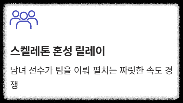 - 스켈레톤 혼성 릴레이: 남녀 선수가 한 팀이 되어 펼치는 속도전