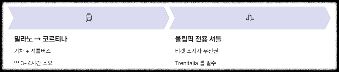 혹시 현지 직관을 계획 중이신가요? (정말 부럽습니다! 😍) 이번 올림픽은 개최지 간 거리가 꽤 멀기 때문에 이동 계획을 정말 잘 짜셔야 해요. 밀라노에서 코르티나까지 가려면 기차와 셔틀버스를 갈아타야 하며 약 3~4시간이 소요됩니다.