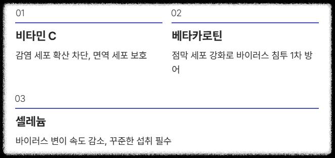 - 베타카로틴: 점막 세포를 건강하게 유지하여 바이러스 침투를 일차적으로 방어합니다.