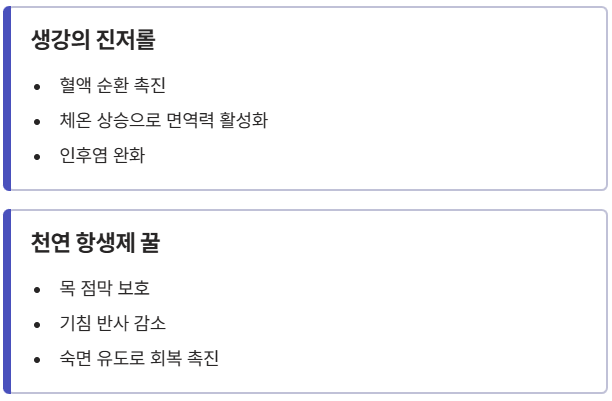 - 생강의 진저롤: 혈액 순환을 촉진하고 체온을 높여 면역력을 활성화하며, 강력한 항염 작용으로 인후염을 완화합니다.