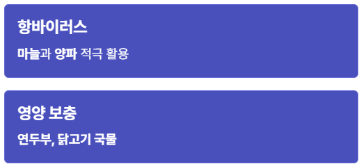 - 치킨 브로스: 전해질 균형을 맞춰 탈수를 예방하고, 따뜻한 온기가 호흡기 혈류량을 늘려줍니다.